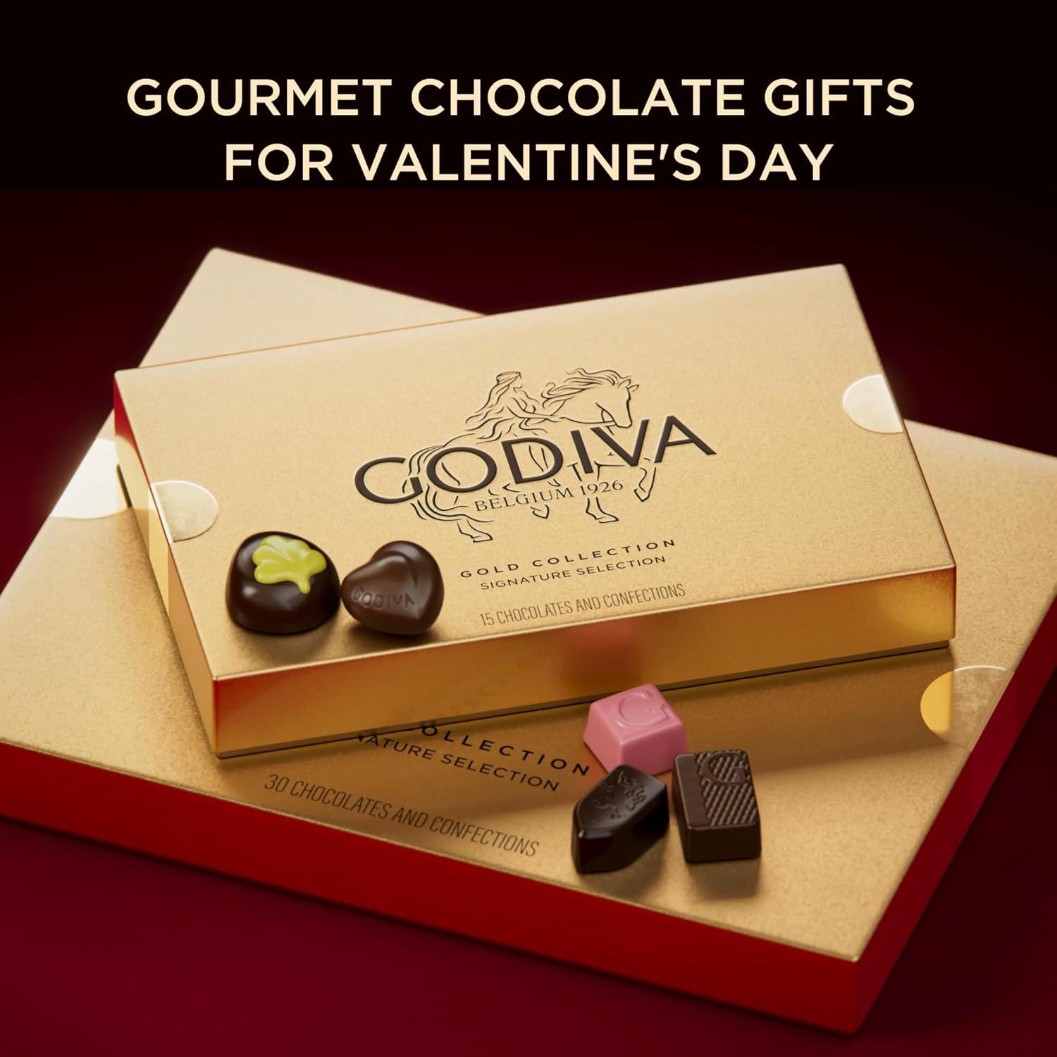 Celebrate love with the Godiva Gold Collection Chocolate Gift Box, a premium selection of gourmet chocolates imported directly from Belgium. Since 1926, Godiva has perfected the art of chocolate-making, blending timeless Belgian craftsmanship with modern creativity. This special edition of the Gold Collection is thoughtfully curated as the perfect gift for her for Valentine’s Day, featuring an indulgent mix of flavors including rich dark chocolate, creamy milk chocolate, smooth vanilla ganache, nutty pralinés, ruby chocolate with a delicate crunch, salted caramel, pistachio, and more. Each piece is a miniature work of art, designed to delight every chocolate enthusiast. Presented in Godiva’s iconic gold box and finished with a striking red ribbon, this elegant assortment transforms chocolate into a romantic keepsake-worthy gift. Perfect for gifting, sharing, or savoring together, it’s an ideal choice for Valentine’s Day surprises, Galentine's celebrations, date nights, anniversaries, or heartfelt expressions of love. Certified Kosher and made with premium ingredients, this collection offers a thoughtful balance of indulgence, quality, and inclusivity. Whether shared with friends, added to a Valentine’s gift basket, or presented as a romantic gesture, the Godiva Gold Collection turns every moment into a celebration of passion, elegance, and Belgian tradition.