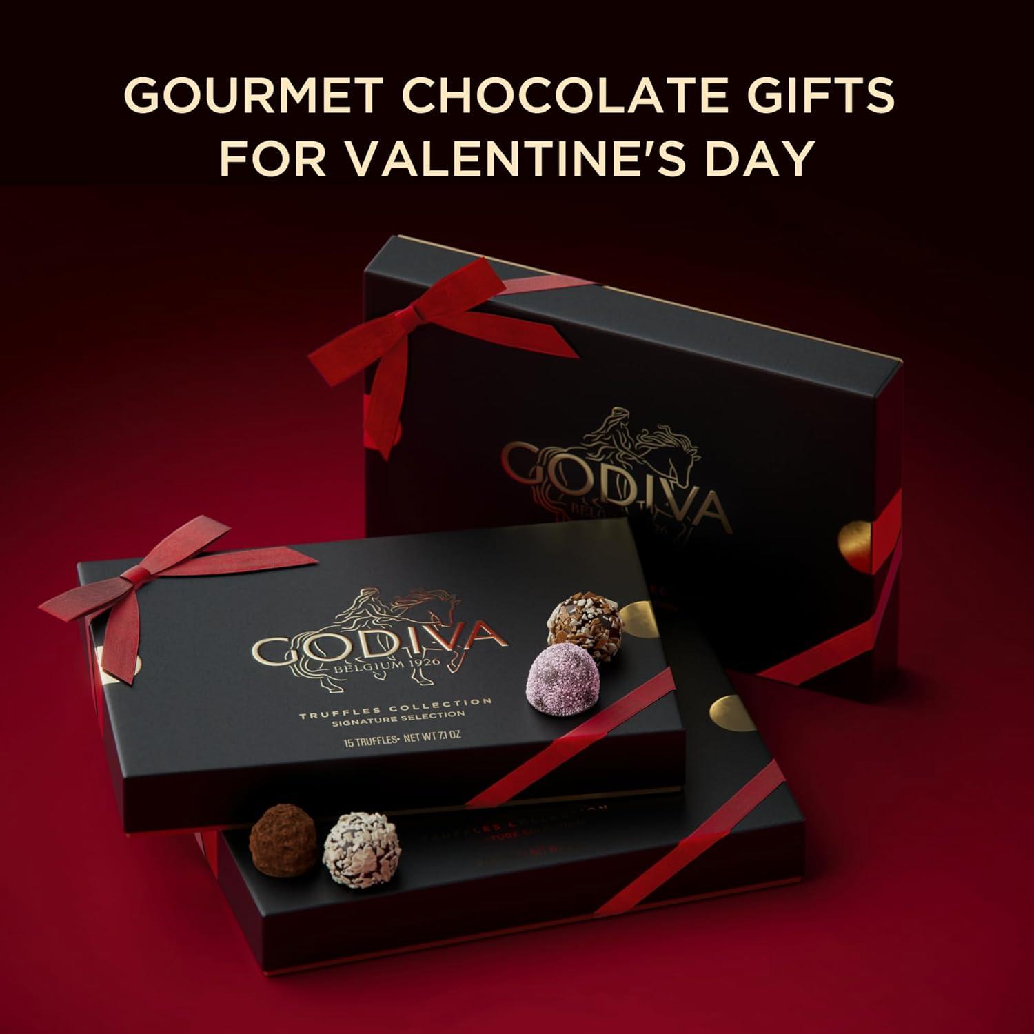 Celebrate love with the Godiva Signature Truffles Gift Box, a 24-piece collection of decadent Belgian chocolates crafted for indulgent moments together presented as the perfect gift for her or him. Since 1926, Godiva has perfected the art of chocolate-making, blending traditional Belgian craftsmanship with modern creativity. This special edition of the Signature Collection is designed for true chocolate connoisseurs, offering a luxurious variety of textures and flavors: silky ganache, creamy pralines, airy mousse, fruity infusions, and buttery caramel, each encased in rich milk or dark chocolate. Every truffle delivers a melt-in-your-mouth experience, making every bite as special as the love it celebrates. The truffles are elegantly presented in a refined black gift box with gold detailing, finished with a striking red ribbon looping around its corners, perfect for Valentine’s Day gifting or Galentine's Day celebrations. Ideal for romantic surprises, date nights, anniversaries, or heartfelt expressions of affection, this luxurious assortment elevates moments of sharing and indulgence. Crafted in Belgium with premium ingredients and certified Kosher, it’s a thoughtful choice for gifting someone you love. Whether shared with friends, presented as part of a Valentine’s gift, or savored together, the Godiva Signature Truffles Collection transforms any moment into a celebration of romance, elegance, and timeless Belgian artistry.